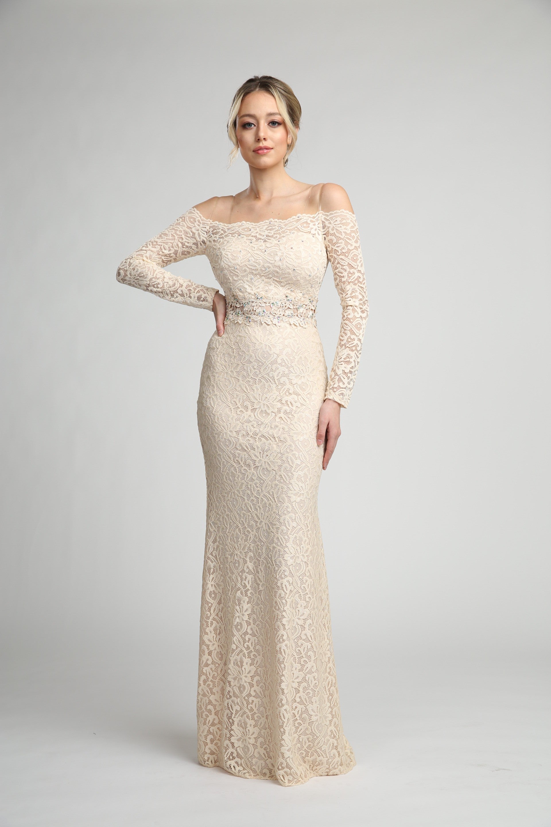This elegant off-shoulder sleeve dress features intricate embroidered lace that gracefully adorns the top, sleeves, and skirt, creating a timeless and sophisticated look. The standout belt blends delicate mesh, sparkling sequins, and detailed floral embroidery, adding a captivating touch that enhances your silhouette. Perfect for special occasions, this dress combines classic design with modern accents to help you make a memorable impression wherever you go. Experience refined style and comfort in a dress crafted to celebrate your confidence and elegance.